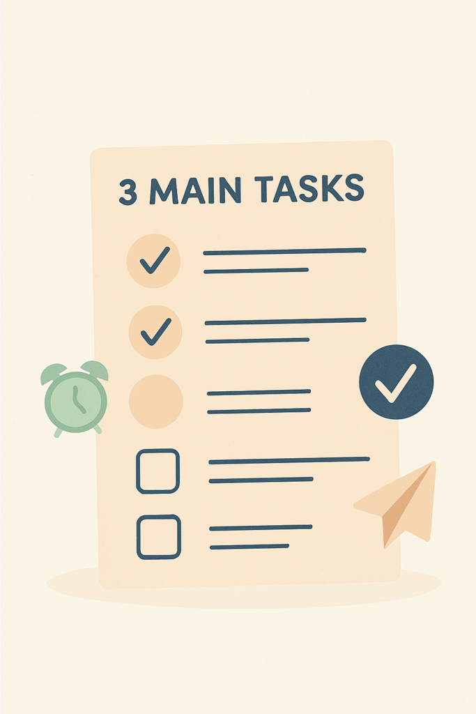 Define 3 high-impact tasks per day (MITs — Most Important Tasks). When everything feels important, nothing truly is.